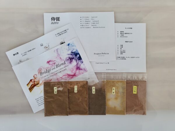 源氏物語の世界を体感するお香 Six in Sense—JIJYU の調香をご自宅で再現するお香創作キットです。天然100%の沈香、丁子、甘松、貝香、鬱金のブレンドです。